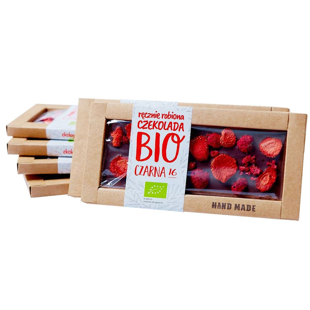 Opis produktuMasa kakaowa minimum 56,5%. Czekolada ręcznie robiona. Zawiera liofilizowane truskawki i maliny.