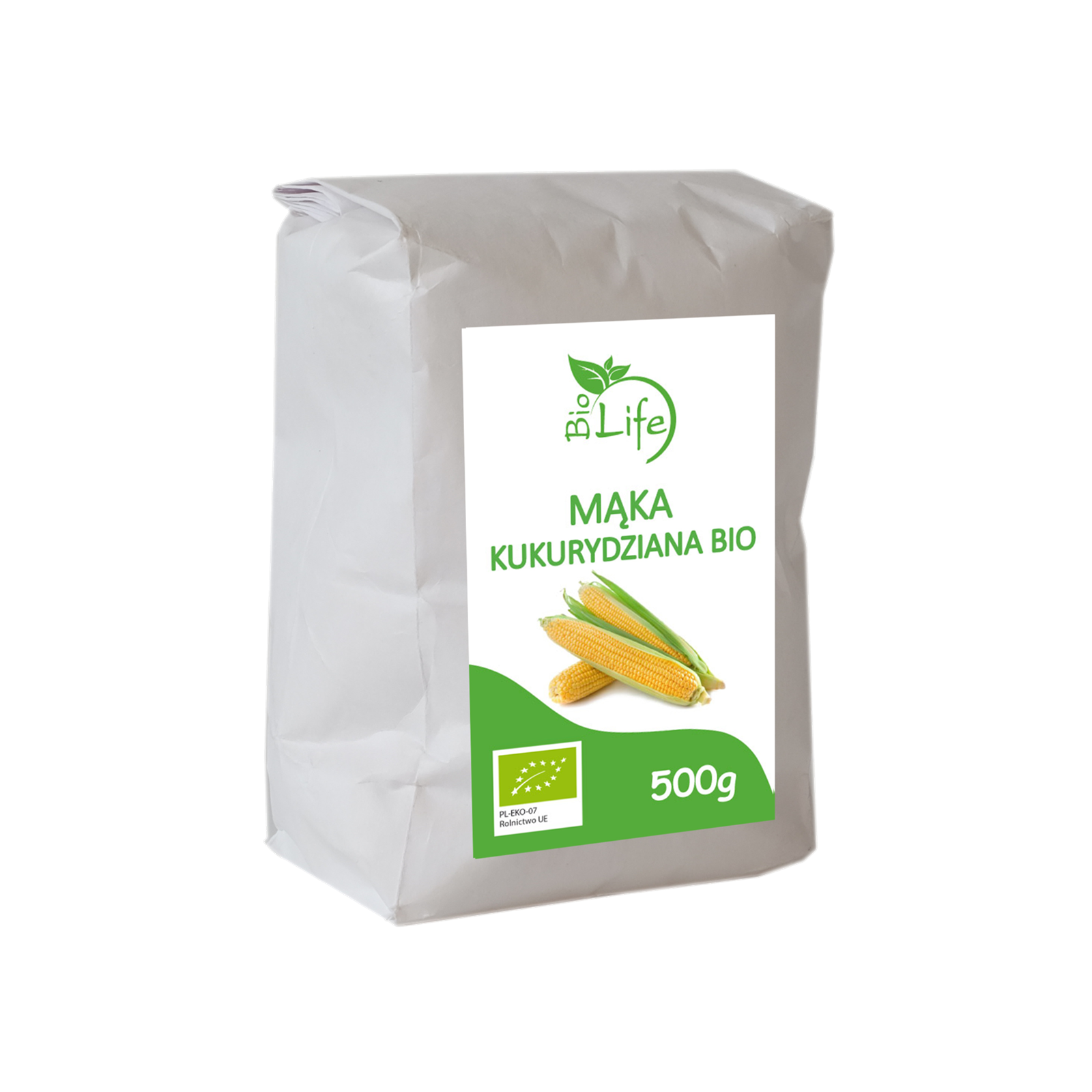 Czuj zdrowie i energię przez cały rok wybierając ekologiczne nieprzetworzone produkty marki BIO LIFE! Ekologiczną mąkę kukurydzianą uzyskuje się w procesie mielenia ziaren kukurydzy. Jest to bezglutenowy zamiennik mąki pszennej. Mąką kukurydziana jest źródłem witaminy B1, B6, folianów, żelaza, magnezu i cynku. Cynk wspomaga odporność. Obecność karotenoidów w mące wspomaga profilaktykę chorób oczu. Używana jest do pieczenia ciast, ciasteczek, tortilli, omletów, naleśników i panierowania.Wartość odżywcza w 100 g produltu
